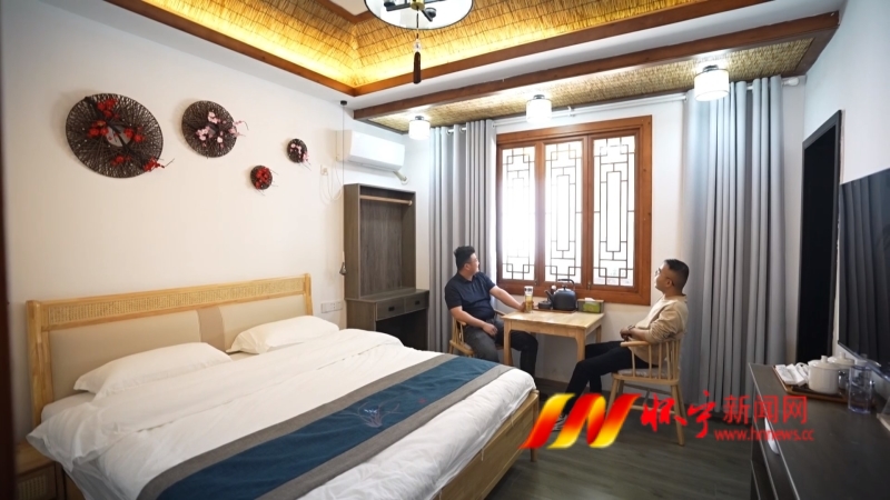 村民楊根甲作為復(fù)興村里首批"吃螃蟹"的人,他既是閑置農(nóng)房流轉(zhuǎn)的先行者,更是鄉(xiāng)村蝶變的受益者。2023年10月,在村里的動員下,楊根甲率先簽下了流轉(zhuǎn)協(xié)議,將閑置了幾十年的老宅交由村經(jīng)濟(jì)聯(lián)合社統(tǒng)一改造。當(dāng)腳手架拆除時,老房變身成了精品客房,這讓楊根甲激動不已。“我家這個房子始建于五六十年代,里面全部是土磚,2023年村里在搞鄉(xiāng)村建設(shè)的時候,我們這個房子已經(jīng)是破舊不堪了,相當(dāng)于是個危房了,2023年村里跟我簽訂了合同,把這個房子流轉(zhuǎn)給村里面,村里面接手改造,現(xiàn)在你看看這個房子建設(shè)的非常漂亮,而且十年之后,所有權(quán)還是我家里的財產(chǎn),所以這個改造我非常滿意,這一項活動我非常有意義,我也為村里做了貢獻(xiàn)。”