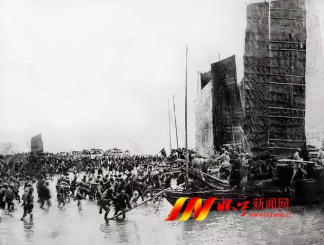 4月21日下午5時許,渡江戰役打響。上百門大炮齊鳴,猛烈炮擊后,各突擊船隊千舟競發,迎著炮火強渡長江。在人民解放軍的強大攻勢下,國民黨苦心經營的長江防線迅速崩潰。