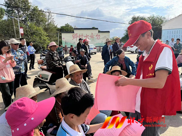 好戲還沒開場,但在村民廣場,一塊塊宣傳板前擠滿了村民?,F場通過設立政策咨詢臺,擺放宣傳展板,懸掛橫幅,發放宣傳彩頁等多種方式進行宣傳民生工程、反詐騙、反邪教、禁毒、鄉村振興等,志愿者向群眾面對面、點對點地宣傳解讀十項暖民心行動的政策內容。