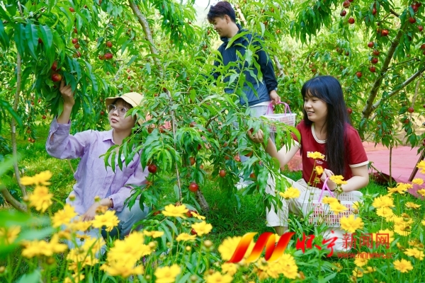5月17日,游客在平山鎮狀元村家庭農場采摘油桃,盡情地享受著采摘的樂趣。平山鎮大段村村民陳真承包家門口近200畝荒山種植油桃、蟠桃、黃桃等品種,使昔日荒山變成了“金山銀山”,碩果盈枝的桃園不僅鼓起了村民的腰包,也成了當地及周邊市民踏青游玩的好去處。 檀志揚 操振東 攝