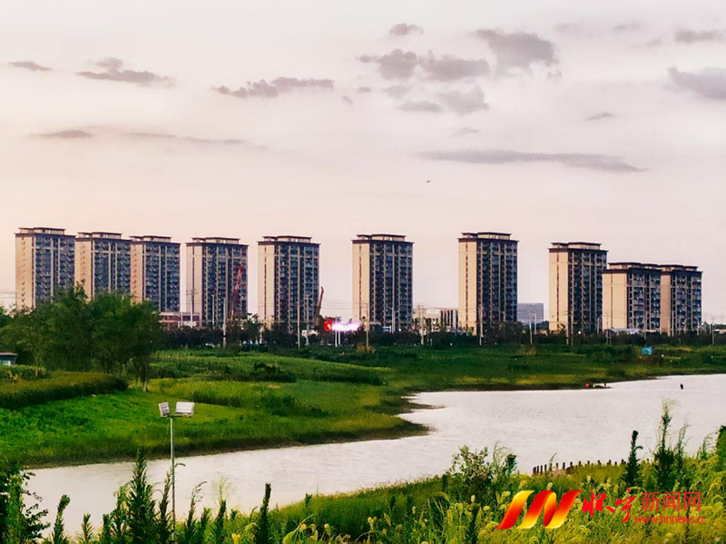 河岸兩邊蔥翠欲滴的草地如同鋪開的綠毯,微風拂過,草浪輕翻,一陣陣清爽的香氣撲面而來,沁人心脾。高樓與錯落的民居相映成趣,村莊的炊煙與悠悠河水交織,在夕陽的映襯下盡顯城鄉交融的和諧之美。